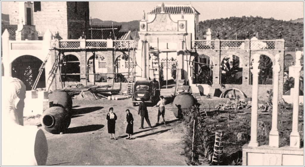 Le chantier de construction de La Carlina entrepris en 1952 ne s'acheva pas avant 1959. On voit ici la fin des travaux du monumental porche d'entrée au Leo Belgicus (ce blog au 17 octobre 2018). Les colonnes romaines à droite sur la photo, surmontées de bustes de marbre blanc (il y en a cinq au total) proviendraient du site d'Italica, la ville romaine proche de Séville ; quelques énormes jarres à vin de terre cuite attendent sur le chantier de pouvoir rythmer le mur d'enceinte de la propriété (on en comptera une bonne trentaine). À l'avant-plan, se trouvent probablement Yvonne Leroy ainsi qu'une personne (espagnole ?) non identifiée.