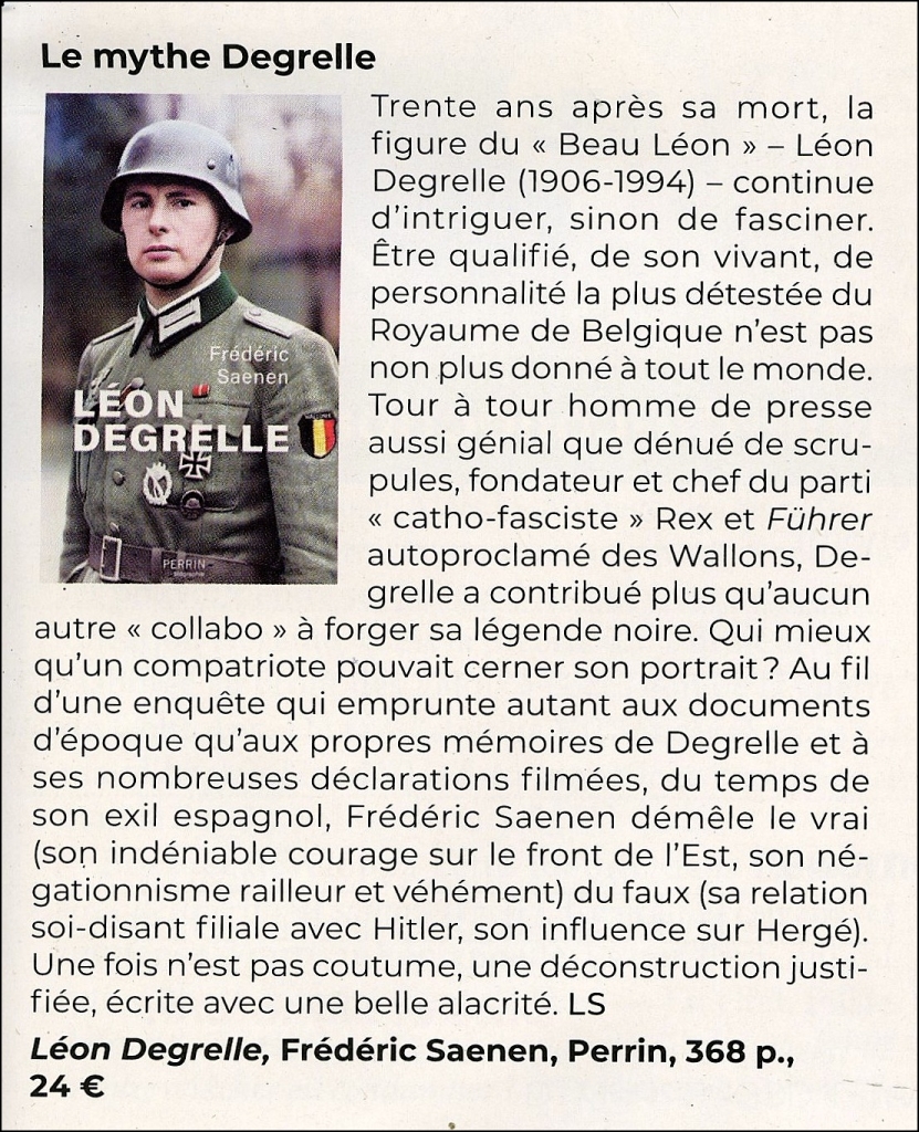 Encore eût-il fallu que Laurent Schang maîtrise son sujet, connaisse quelque chose à Léon Degrelle, voire même ait véritablement lu le monument de sornettes publié par son éditeur Perrin. Car enfin, il faut ne pas avoir ouvert le pensum pour prétendre gratuitement (et de quelle autorité ?) que « la biographie de Frédéric Saenen est incontestablement la plus complète, la plus documentée et la plus approfondie » ! Nous avons montré comment, dès les toutes premières pages, Saenen trafique ses sources pour laisser entendre, par exemple, que Léon Degrelle était un criminel de guerre (ce blog au 25 mars 2025). Schang eût pu le vérifier lui-même, lui qui, spécialiste maison de la Seconde Guerre mondiale, a certainement accès à la quarantaine de volumes des minutes du procès de Nuremberg où Saenen prétend avoir trouvé son information !...