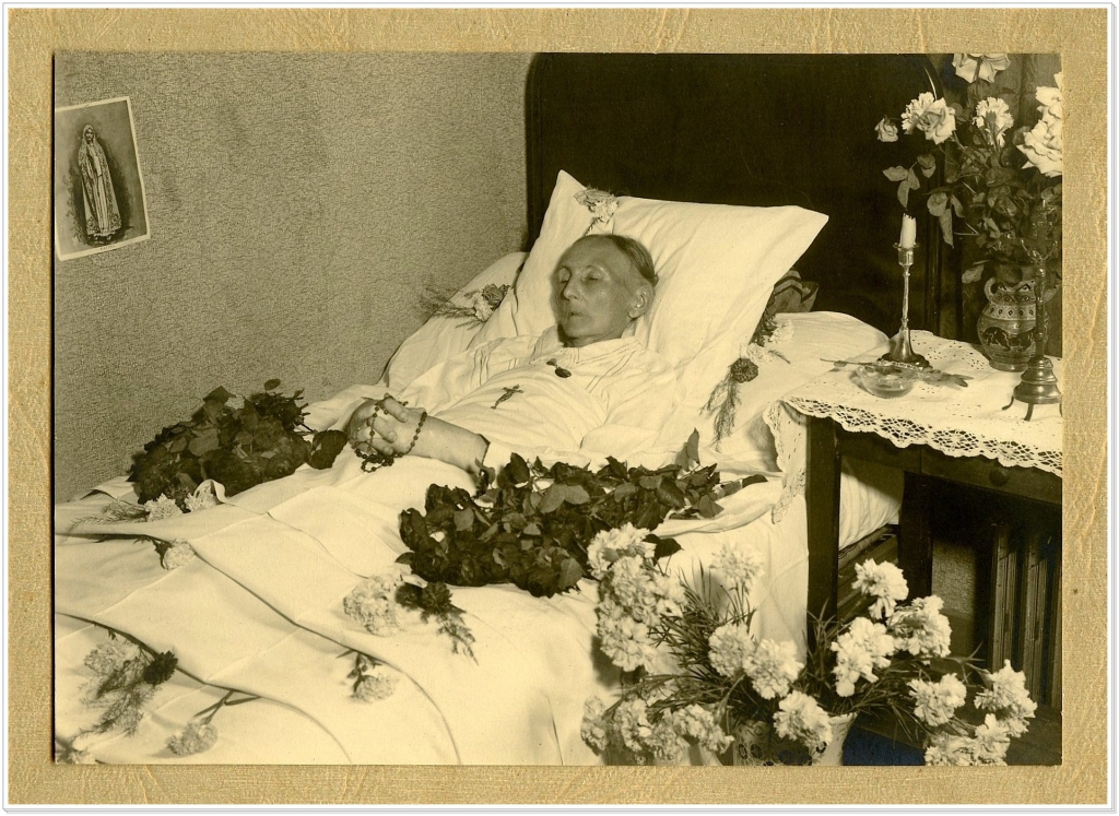 Emprisonnée (sans jamais avoir été condamnée par quelque tribunal) dans un hospice bruxellois surveillé par la gendarmerie et géré par des religieuses, Marie-Catherine Boever, la Maman de Léon Degrelle, rend l'âme, le 23 octobre 1947. Anéantie par la nouvelle de la condamnation sévère de son mari Édouard Degrelle, le 10 octobre précédent, elle était seulement coupable –comme lui– d'avoir donné le vie à Léon Degrelle ! Sur sa poitrine repose le crucifix que son fils avait réussi à lui faire parvenir, en même temps que ses vers de La Chanson Ardennaise (ce blog aux 20 mars et 15 juin 2020) : ses sœurs pourront lui rendre cette relique sacrale, via la famille de Robert Du Welz, en même temps qu'elles lui enverront une mèche des cheveux de leur Maman et quelques-unes des roses disposées sur le lit mortuaire.