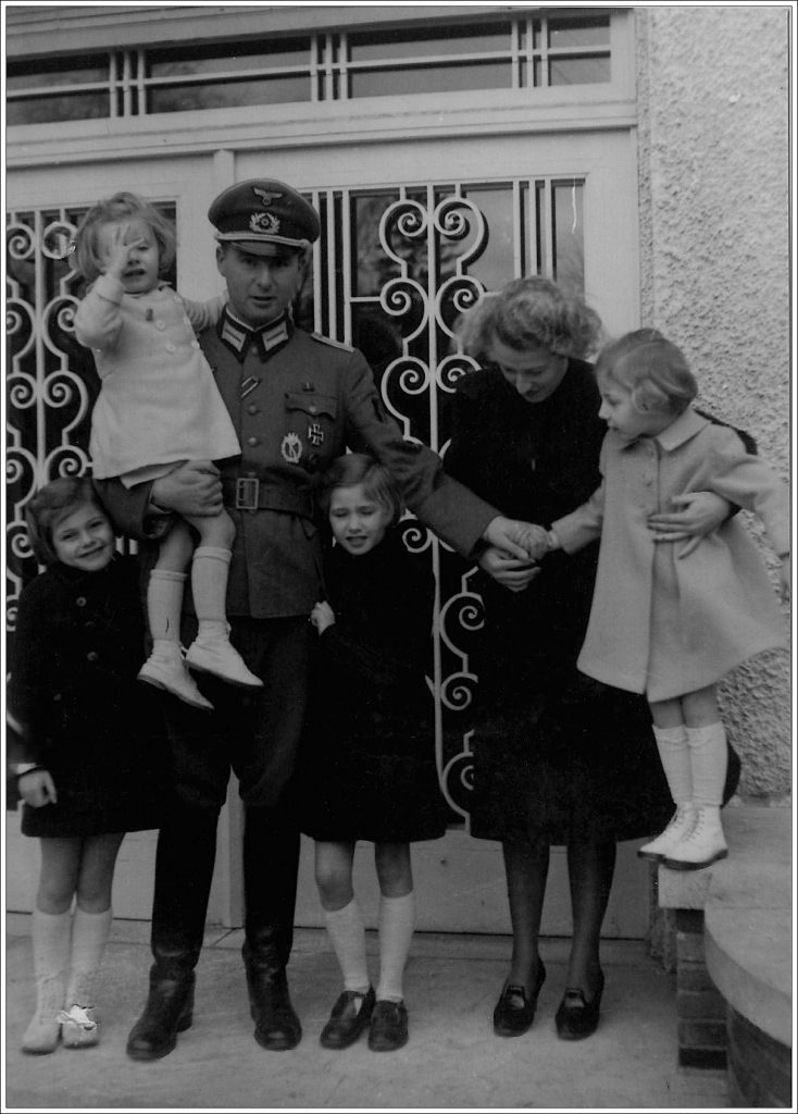 Léon Degrelle (en uniforme de la Wehrmacht et non de la Waffen SS qu'il ne rejoindra qu'en juin 1943) avec toute sa famille : de gauche à droite, Anne (née le 27 juillet 1936, ce blog au 13 mars 2023), Léon-Marie (né le 4 mai 1939) dans les bras de son Papa, Chantal (née le 13 février 1934) entre son Papa et sa Maman, Marie-Paule Lemay, qui enlace, debout sur le muret, Godelieve (née le 14 avril 1938, ce blog au 17 avril 2023) à qui son Papa donne également la main. Il ne manque donc que Marie-Christine, qui viendra au monde le 1er août 1944 : cette photo fut prise dans la propriété familiale de la Drève de Lorraine probablement au moment des funérailles à Bruxelles, le 17 avril 1943, de Paul Colin, le directeur du Nouveau Journal, assassiné trois jours auparavant (ce qui expliquerait les tenues de deuil de la Maman et de ses deux aînées).