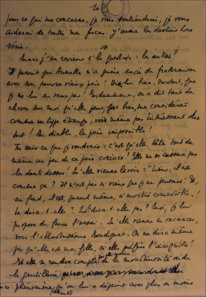 Tu sais ce que je voudrais : c'est qu'elle tâte tout de même un peu de ce père coriace ! Elle ne se cassera pas les dents dessus ! Qu'elle vienne le voir : « Tiens, il est comme ça ? Il n'est pas si vieux que je ne pensais ! Et au fond, il est, quand même à moitié comestible » !